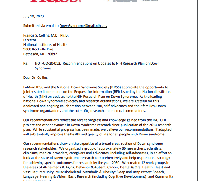 LuMind IDSC and NDSS Submit Joint Recommendations for Advancing NIH-Funded Down Syndrome Research