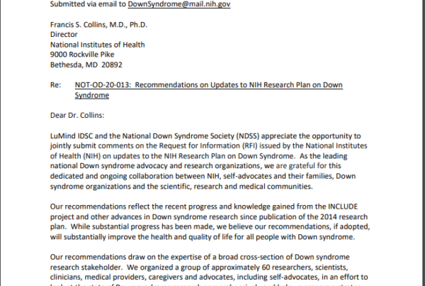 LuMind IDSC and NDSS Submit Joint Recommendations for Advancing NIH-Funded Down Syndrome Research